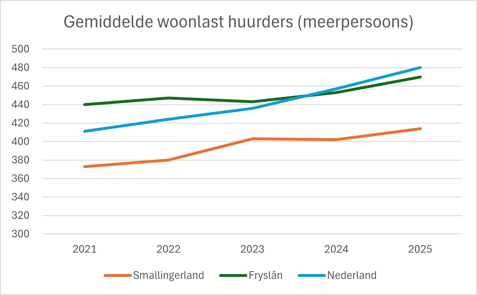 In de onderstaande grafiek zijn de gemiddelde woonlasten voor de huurders opgenomen. Ook hierbij is een vergelijking gemaakt met Smallingerland, Fryslân en Nederland. De gemiddelde woonlasten voor de huurders van Smallingerland liggen een stuk lager dan de gemiddelde woonlasten van Fryslân en Nederland. Daarnaast laten de woonlasten van Smallingerland een minder snelle stijging zien dan de gemiddelde woonlasten van Nederland.