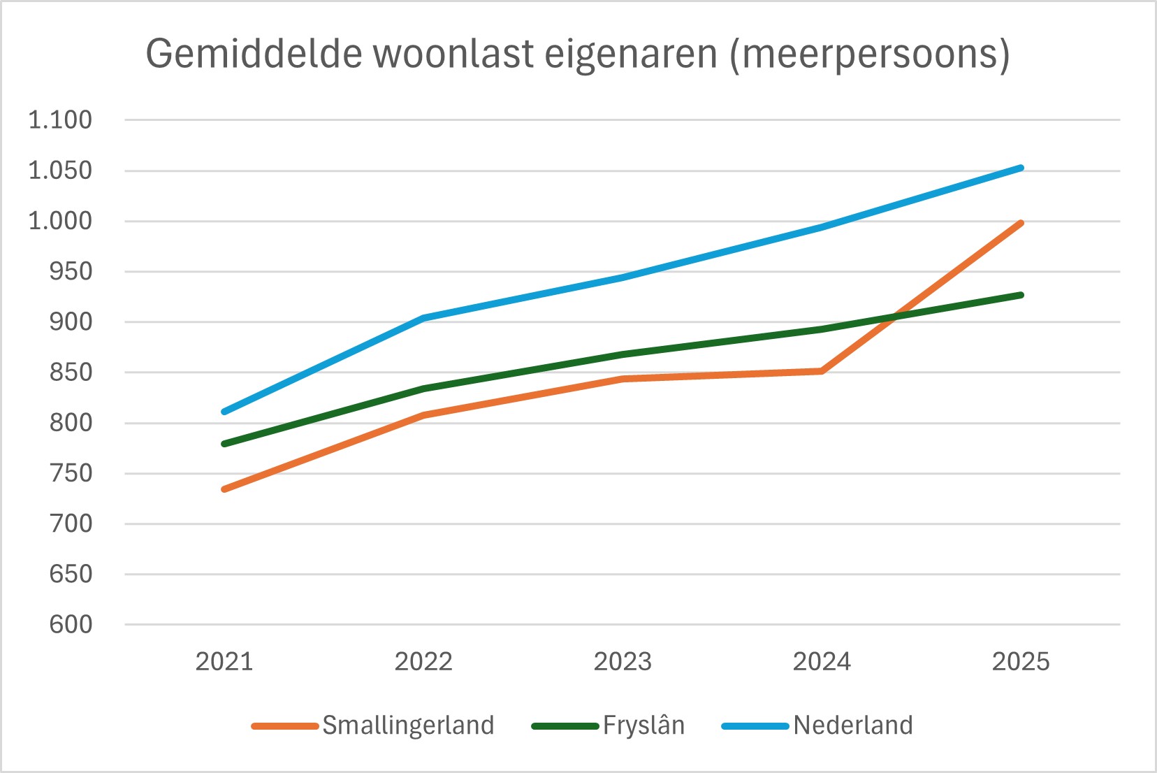 In de onderstaande grafiek zijn de gemiddelde woonlasten voor woningeigenaren van de afgelopen jaren opgenomen. Hierbij is de vergelijking gemaakt tussen Smallingerland en het gemiddelde van Fryslân en Nederland. De gemiddelde woonlasten van Smallingerland liggen lager dan de gemiddelde woonlasten van Nederland.